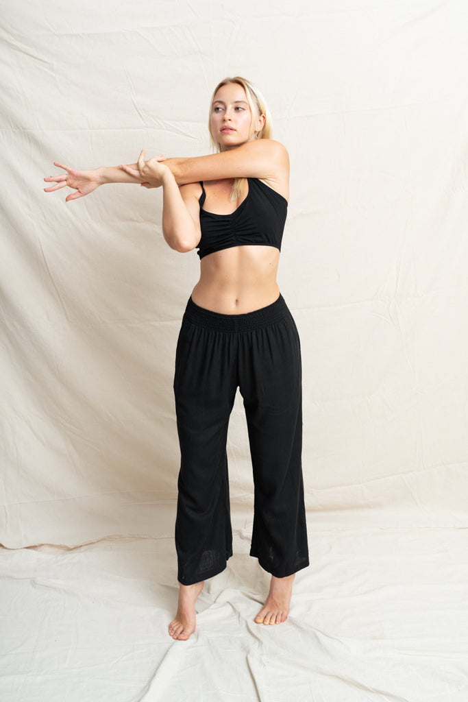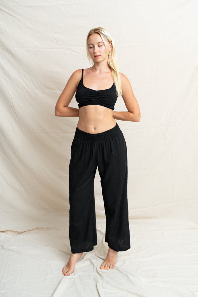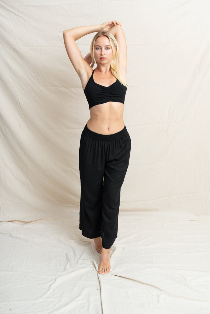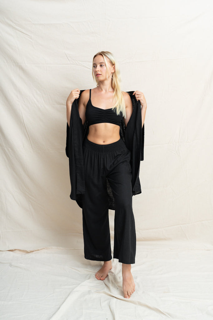 • Relaxed wide leg cut with falls open and loose, creating a soft drape that moves like air around you. Just freedom.