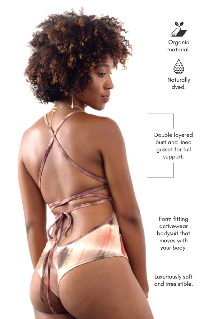 Like being wrapped in a tangle of kisses,  this delicious bodysuit reveals the innate majesty and play within.  The soft breathable organic bamboo lets you stretch in every direction while the  breezy open back and snug criss-cross straps, will make you feel ready to pounce.
